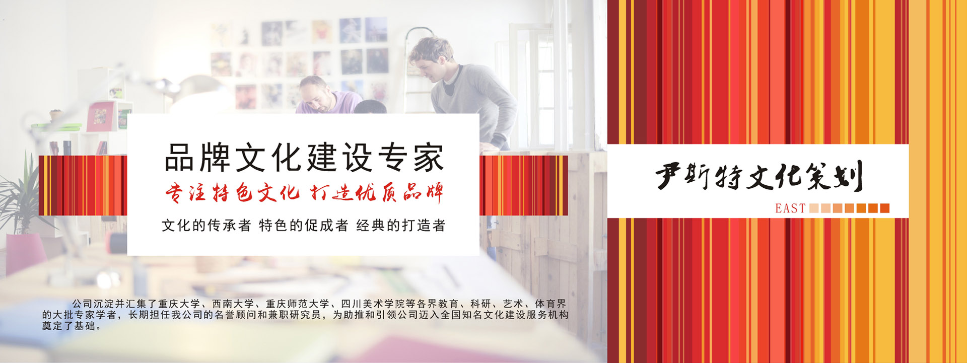 重慶尹斯特文化傳播有限公司全體同仁堅(jiān)守“文化的傳承者,特色的促成者,名企的打造者”的服務(wù)宗旨,齊心協(xié)力,不斷進(jìn)取,攜手為西部乃至全國的企業(yè)策劃和企業(yè)文化建設(shè)事業(yè)作出新的貢獻(xiàn)。